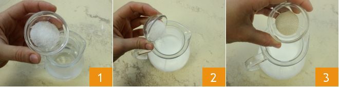To prepare the rustic pie, start with the dough: dissolve the salt in warm water 1 while the sugar 2 and yeast (alternatively you can use 12g of fresh yeast) 3 in warm milk.