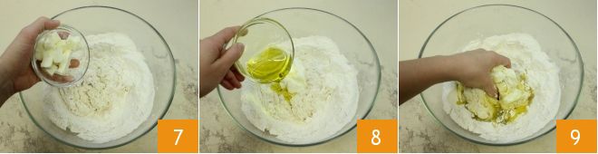 Add the softened butter in pieces 7 and the extra virgin olive oil 8. Then start working the ingredients with your hands 9.