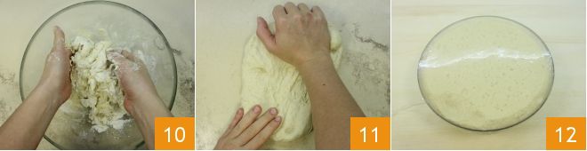 Work the ingredients 10 until they are combined, then transfer the dough to a lightly floured board. Continue working the mixture with your hands until you get a soft, smooth, and homogeneous dough 11. You can perform these operations with a stand mixer, first collecting the ingredients at medium speed with the paddle attachment and then continuing to knead with the dough hook. Form a ball, place it in a bowl, cover it with plastic wrap, and let it rise at room temperature (for a couple of hours, or until it has doubled in volume) 12.