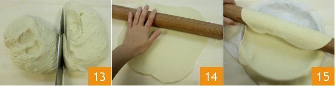 After the necessary time has passed, divide the dough in half 13, roll out one half with a rolling pin until you get a sheet about 0.2 inches thick 14, and after lining a 10.5-inch diameter baking pan with parchment paper, spread the sheet of dough using the rolling pin 15.