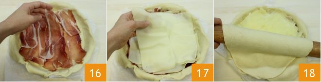 Adhere the dough well to the edges and bottom, then start filling the rustic pie with slices of speck 16, then add the slices of fontina cheese 17. Then roll out the other half of the dough to close the pie 18.