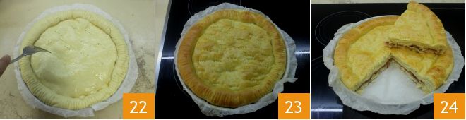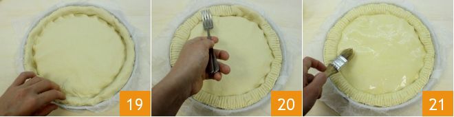 Adhere the dough to the filling and, by tapping with your fingers, create a swollen edge 19 which you will then decorate with the tines of a fork to create stripes 20. In a small bowl, beat the egg and add a tablespoon of milk: emulsify the ingredients and then brush the surface of the pie 21; then let it rise for another hour at room temperature, covered with plastic wrap.