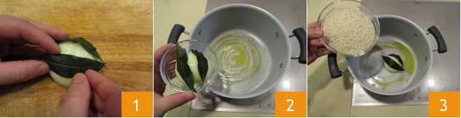 To prepare the rustic skewers with saffron rice, the first thing to do is prepare the rice, so in a pot pour the water and bring it to a boil, you will need it right after toasting the rice; fix the bay leaf with the cloves on the onion 1 and let it flavor for a few moments in extra virgin olive oil 2, then add the rice and toast it for a few minutes, stirring constantly 3.