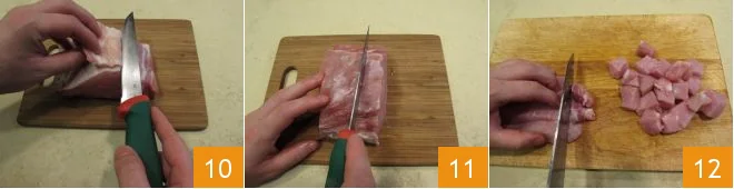 Meanwhile, prepare the skewers, starting with the pork loin, removing the excess fat 10, then slicing it into slices about 1 inch thick 11 and after obtaining the lozenges, you can cut them into cubes about 1.5 inches in size 12.