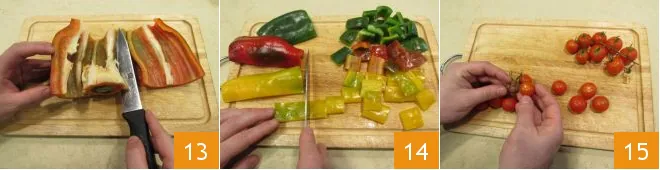 After washing the bell peppers, dry them and remove the seeds and the central part 13 and cut them into squares roughly the size of the pork loin chunks 14; wash the cherry tomatoes and detach them from the branch 15.