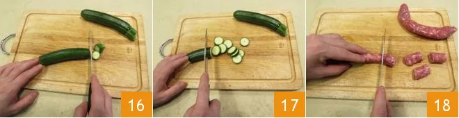Then remove the ends of the zucchinis 16 and cut into slices about 0.5 inches thick 17; also cut the sausage into pieces as big as the pork loin 18.
