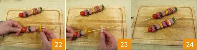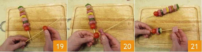 When you have all the ingredients ready, you can assemble the skewer by inserting the pieces onto a wooden skewer, starting with the cherry tomato 19, then the piece of sausage 20, the zucchini slice, and the piece of loin 21.