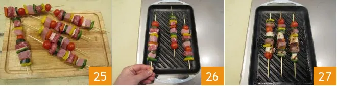 Keep going like this until you have all 6 skewers 25. Heat a grill and place the skewers on it 26, letting them cook for 2-3 minutes on each side 27.