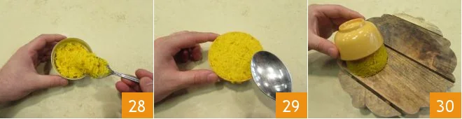 Finally, if you want, you can serve the rice at the bottom of the serving plate, or more originally you can pour it into a small container 28, filling it to the brim and leveling it with the help of a spoon, let it cool for a few minutes 29, then unmold by placing the shape on the serving plate and immediately serve the rustic skewers with saffron rice 30.
