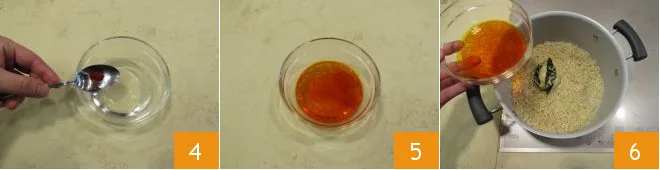 Collect some hot water in a container (if you prefer, a vegetable broth is also fine) and pour in the saffron 4, dilute it well 5 and then pour it into the pot with the rice 6.