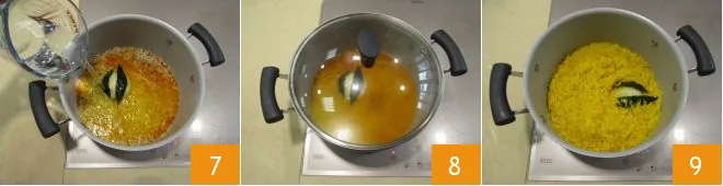 Also add the rest of the boiling water (alternatively, to make the rice even tastier, you can use vegetable broth) 7 and continue cooking over low heat, covering with a lid 8 until the rice has completely absorbed the water 9.