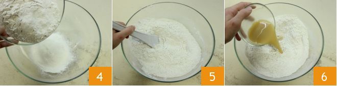 Then dissolve the salt in the remaining lukewarm water 7, stir, and gradually pour the water over the dough 8, stirring as you go to absorb it 9.