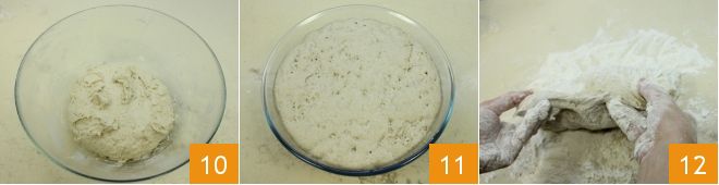 Continue mixing to create a more compact mixture 10. Then let it rise in the bowl for at least 1 hour at room temperature, covered with plastic wrap. After the indicated time, it will have doubled in volume and will have bubbles 11. At this point, you can flour a work surface and start handling the dough: you should create a rather thick rectangular shape and fold the dough over itself 12.