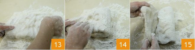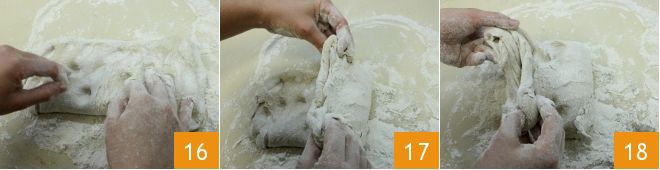 Make some indentations with your fingers on the dough 16 and create more folds (17-18). Finally, shape the dough into a rectangular shape.