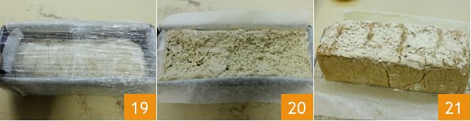 Line a 10x4 inch loaf pan with parchment paper: this will allow you to easily remove the bread once baked. Place the dough inside and cover it with plastic wrap 19; let it rise for about 3 hours at room temperature or until it reaches the edge of the pan 20. At this point, bake it in a static oven at 428°F for 35 minutes (392°F for about 30 minutes if using a convection oven). Then remove it from the oven 21, let it cool slightly, and serve your rye bread sliced to accompany lunches and dinners or to enjoy at breakfast!