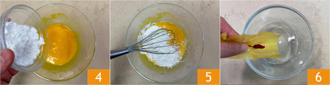 Add the cornstarch 4 and mix 5 until incorporated. Dissolve the saffron in a tablespoon of hot water 6.