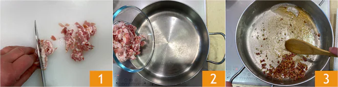 To prepare the saffron risotto with taleggio and pancetta, first prepare the vegetable broth following our recipe. Cut the pancetta into strips 1, place it in a saucepan 2, and cook over medium-high heat for 10 minutes 3. The fat released will be used to toast the rice.