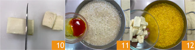 Cut the taleggio into cubes, removing the rind 10. When there are 5 minutes left until the risotto is done, add the dissolved saffron 11 and stir to combine. When the rice is cooked, turn off the heat and cream with the taleggio 12.