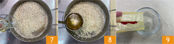 At this point, deglaze with the white wine 7 and let the alcohol evaporate completely. Cook the rice by adding one ladle of broth at a time, always waiting for the previous one to be absorbed 8. Meanwhile, dissolve the saffron in a little warm broth 9.