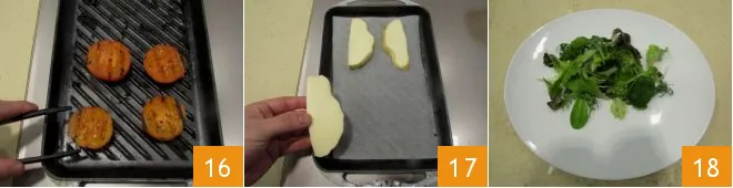 Finally, finish with the tomatoes, grilling them for 4 minutes until they are well grilled 16. Cut a sheet of parchment paper to the size of the grill and place it to proceed with cooking the scamorza. Distribute the slices and grill them for a few seconds 17. At this point, place the mixed salad on a serving plate 18 along with the vegetables;