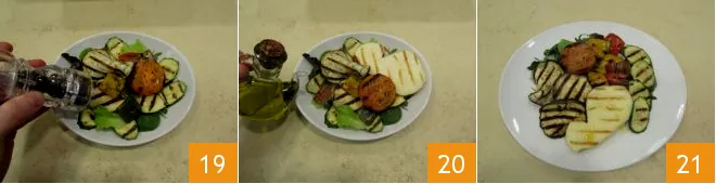 adjust the salt and pepper 19 and season with olive oil. Finally, you can serve and enjoy your salad with scamorza and grilled vegetables 21.