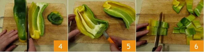 take the peppers, remove the top part, cut them in half 4, then use a knife to remove the white filaments and seeds inside 5. Cut them into slices, then into rather large cubes and set aside 6.