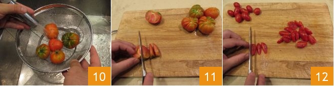 After washing the tomatoes 10, remove the stem, cut them in half, and then into slices to get 4-5 wedges from each half tomato 11. Do the same with the cherry tomatoes 12 by cutting them into 4 parts.