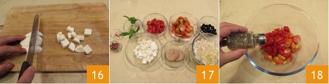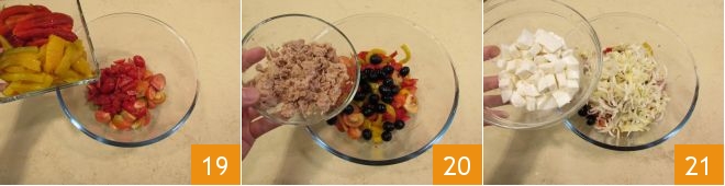 Then add the peppers 19, whole black olives, and the tuna that you have flaked with a fork 20, the endive, and the mozzarella cubes 21.