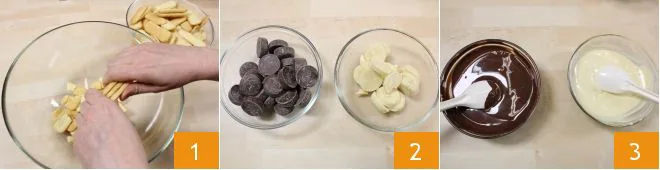 To prepare the two-chocolate salami, start by preparing the white chocolate mixture, which you will use to create the heart of the salami. Coarsely break 100 g of dry biscuits (or Pavesini) with your hands and set them aside 1. Then melt the dark and white chocolate separately in the microwave or a bain-marie and set them aside (2-3).