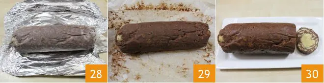 After this time, remove the two-chocolate salami from the aluminum foil and parchment paper (28-29), place it on a serving platter, and slice it 30, revealing the delicious white chocolate heart in every portion!