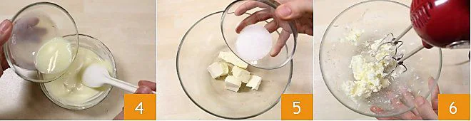 Add the warmed condensed milk with the cream to the melted white chocolate 4, mix well, and let it cool at room temperature. If the mixture is too thick, add a couple of tablespoons of hot cream. In another bowl, place the softened butter at room temperature and the sugar 5, use an electric mixer to whip it all together to get a creamy mixture 6.
