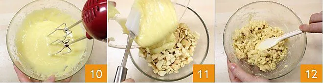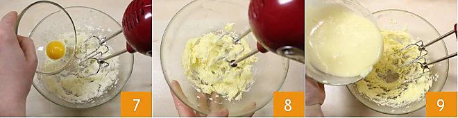 Then add the egg yolk 7 and continue beating until the mixture is white and fluffy 8, add the white chocolate along with the now-cooled condensed milk 9, and continue mixing.