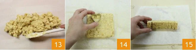 Place the biscuit mixture between two sheets of parchment paper 13, and press it with a rolling pin to shape it into a square about 1 cm (0.39 inches) thick 14, and place it in the fridge to firm up and become compact. Then, using a heart-shaped cookie cutter, cut out 9 small hearts, place them in a row on a sheet of parchment paper, one next to the other 15, wrap the parchment paper around the hearts, and tightly close the ends like a candy, and place to firm up in the freezer for half an hour.