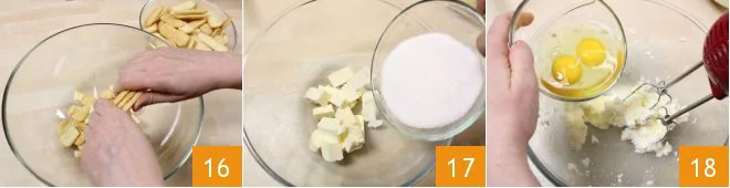 Meanwhile, prepare the dark chocolate mixture that will be the wrapper for the heart, coarsely break 200 g of biscuits; in another bowl, place the butter, add the sugar 17, and beat for a few minutes until you get a soft mixture, then add the eggs 18.