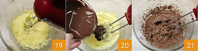 Beat again to incorporate them, and when you have a white and fluffy mixture 19, add the previously melted and now warm dark chocolate 20 and work the mixture until you have a homogeneous consistency 21.