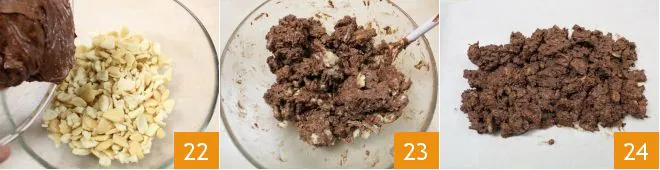 Add the chocolate mixture to the broken biscuits 22, mix it all 23, cover with plastic wrap, and let it firm up in the refrigerator for about 15 minutes. Then place the dough on a sheet of parchment paper, shaping it into a rectangle 34 large enough to entirely cover the white part.