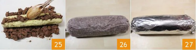 which you will place in the center of the dark chocolate mixture 25. Cover with some chocolate mixture and compact it around the heart, giving it a sausage shape. Wrap the salami first tightly in parchment paper, forming it as if wrapping a candy 26, and then in aluminum foil 27 to keep it pressed; let it firm up in the refrigerator for 2-3 hours.