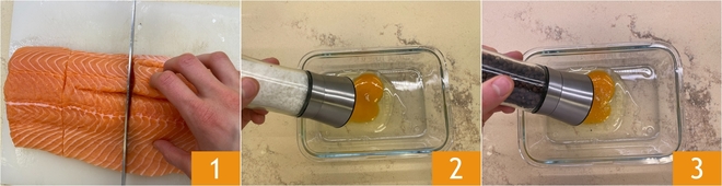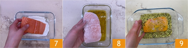 Pass the salmon fillets first in flour 7 and then in the beaten eggs 8. Finally, cover them with crushed pistachios 9.