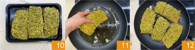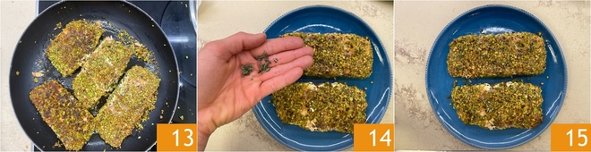 Ensure that the crushed pistachios adhere well to all sides of the salmon 10. Place the fillets in the skillet 11 and cook over medium heat for about 10 minutes 12.