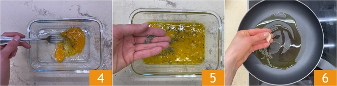 Beat the eggs with a fork 4 and flavor with some fresh thyme leaves 5. In a skillet, let a splash of oil infuse with fresh thyme and a clove of garlic 6.