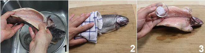 To prepare the salmon trout with orange, start by cleaning the trout: make a lengthwise cut on the lower part of the fish and remove the entrails, then rinse it well under running water and dry it (1-2). Sprinkle the trout's flesh with salt 3 and
