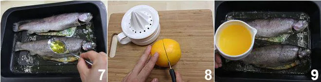 Bake the two trout at 350°F for about half an hour: during cooking, occasionally move the baking dish to loosen the fish from the bottom (without touching it) and baste it with the released cooking juices 7. Five minutes before the end of cooking, squeeze the juice of an orange 8 and pour it over the trout 9. Finish cooking in the oven, and once ready, remove the trout and place them on a serving platter.