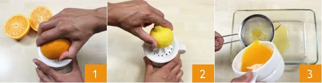 To prepare the citrus salmon with pilaf rice, start by marinating the salmon: get a citrus juicer and squeeze the juice of 5 blonde oranges and 2 untreated Sorrento lemons (1-2). Strain the juices with a sieve into a large baking dish with high sides 3, to remove seeds and pulp pieces.