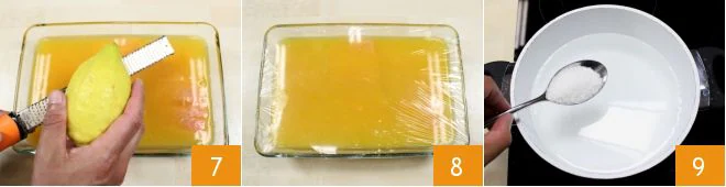 Immerse the deboned salmon fillets in the juice inside the baking dish 4, grate a pinch of peeled fresh ginger 5, and add the zest of 2 oranges 6.