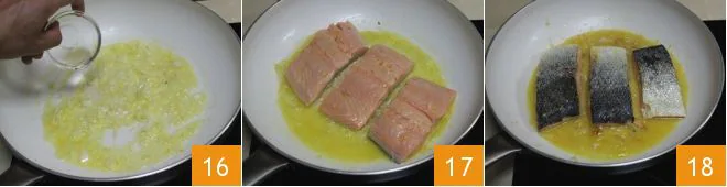 Then add acacia honey 16 and, after the salmon fillets have marinated, transfer them to the pan, keeping the marinade juice aside, and place them with the skin side down in the pan 17. Cook for 5 minutes over moderate heat, then turn them over to the flesh side and cook for 2 minutes 18.