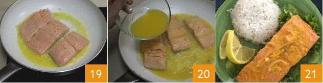 Turn the salmon fillets back to the skin side 19, increase the heat, and deglaze everything with a glass of the marinade juice 20. Salt to taste and cook for 1 minute so that the citrus juice creates a delicate sauce. When the salmon is ready, place it on a serving dish and accompany it with pilaf rice. For a more pleasing aesthetic, spoon the pilaf rice, which will have cooled slightly, into a round mold or a small bowl, then invert it onto a serving plate, creating a dome shape. Then make a bed of salad and place a salmon fillet on top, accompanied by the citrus sauce 21: your citrus salmon with pilaf rice is ready to be enjoyed!
