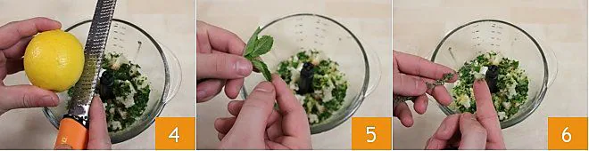 add the zest of half a lemon 4 and add the mint leaves 5, thyme 6,