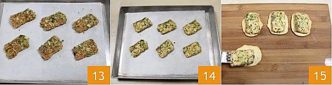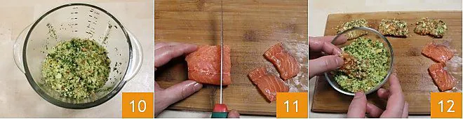 Coarsely chop the mixture 10, not too finely, and transfer it to a bowl. At this point, take care of the salmon, pat the fillets dry, and cut 12 slices the same size as the flatbreads on which they will be placed 11. Coat the salmon fillets in the breadcrumb mixture 12, making sure it adheres well on all sides.
