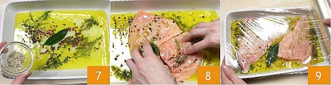 black pepper, pink pepper, salt, dill, thyme, bay leaf, anise seeds, and fennel seeds 7. Add the salmon fillets and gently massage them so that the marinade flavor penetrates the flesh. Cover the dish with plastic wrap and let the salmon marinate for 34 hours in the refrigerator.