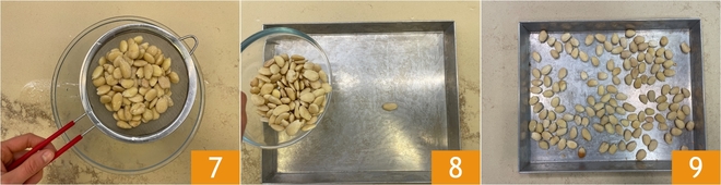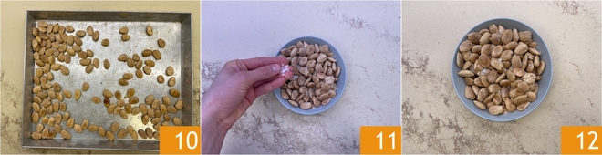 After the soaking time, drain the almonds 7 and spread them on a baking sheet 8. Bake in a static oven at 350°F for 15-20 minutes 9.